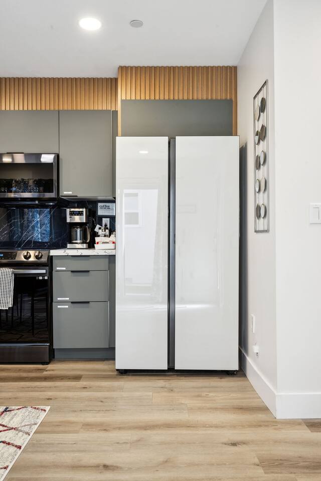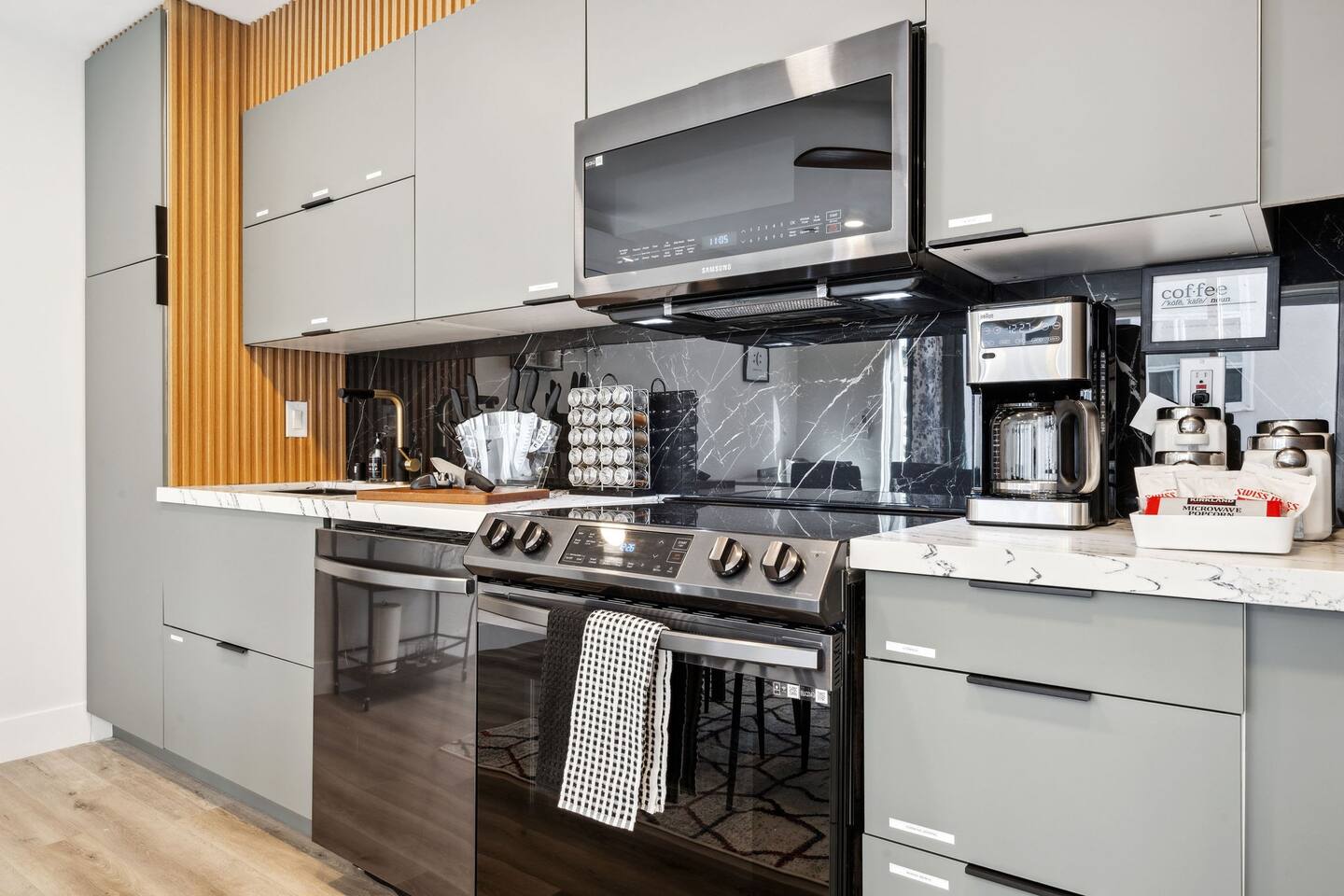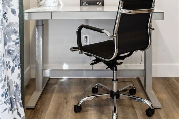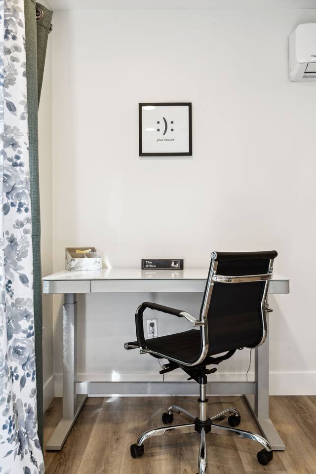 Modern Amenities: Fully equipped kitchen, smart TV, and an automatic rising work desk for greater comfortability when working long hours on the computer.